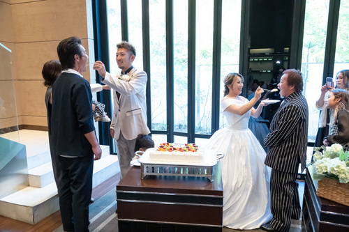 ケーキ入刀&ファーストバイトはご家族全員で手を取り合い行いました🎂