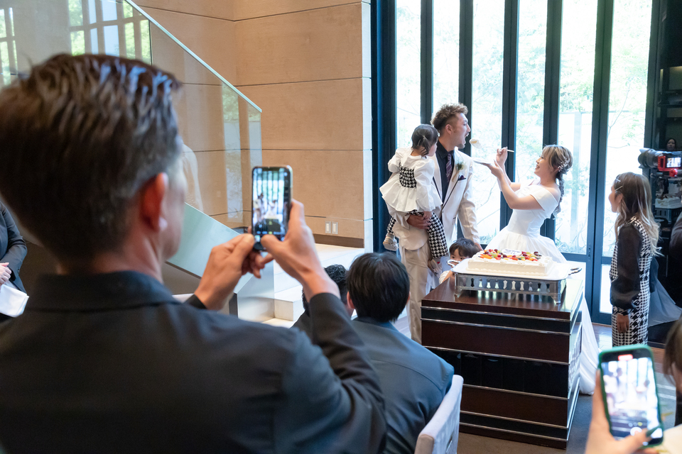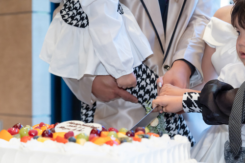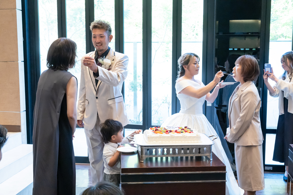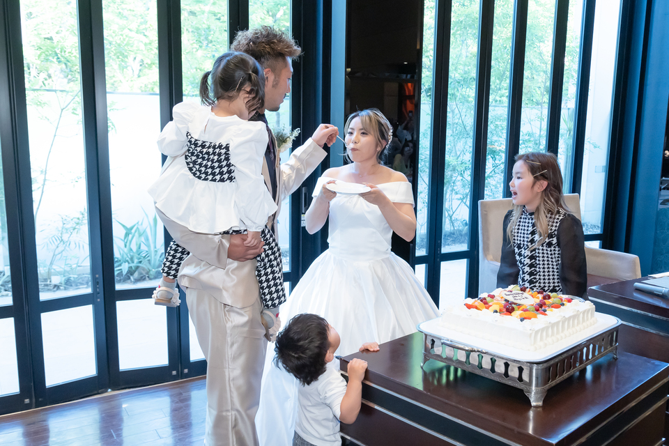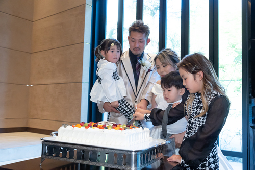 ケーキ入刀&ファーストバイトはご家族全員で手を取り合い行いました🎂